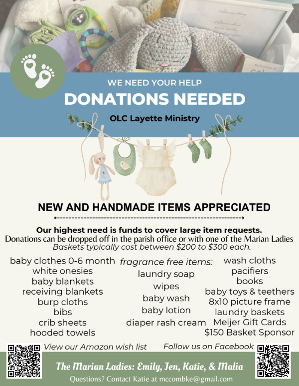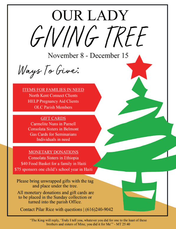 As cooler weather arrives, many of our neighbors in northern Kent County are in need of warm clothing—and you can help! OLC is collecting new or gently used coats, hats, and mittens for children and adults November 8-16. Please place your donations in the large box by the Adoration Chapel.
